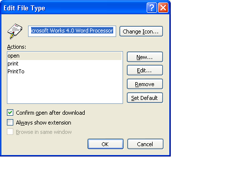 We have a few old die hards who do not want to trade in their Works 4.5 for Word 2003.  The problem which just started is when you create a new works document and save it as a .wps then when windows creates an icon it places the Word icon beside it.  The file association was set to word but I changed it to Works but it still has the word icon on it.