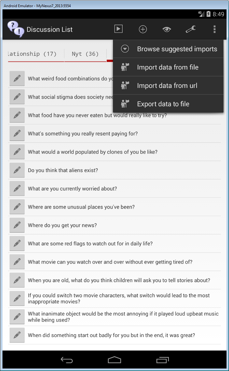 DiscussionList is a simple app that lets you manage a collection of relationship/discussion questions, to facilitate weekly discussions, etc.