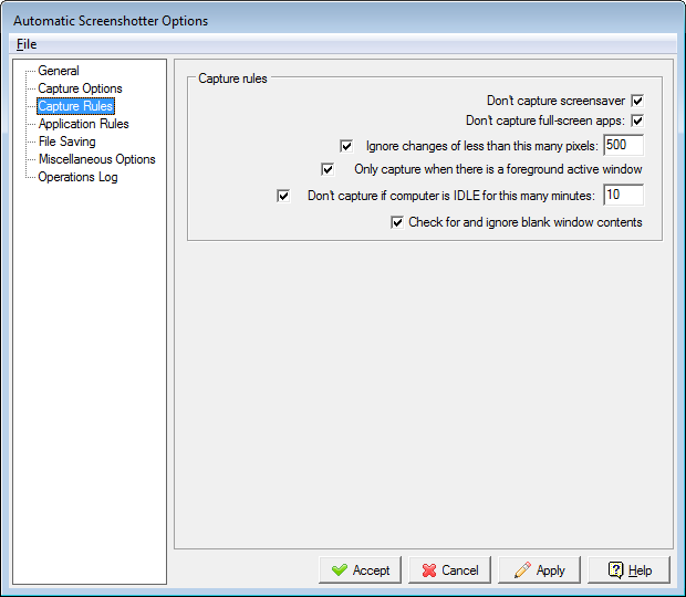 - It can be configured to ignore capture when your pc has been idle for a certain amount of time, or when screensaver is running, or when full-screen games are running.